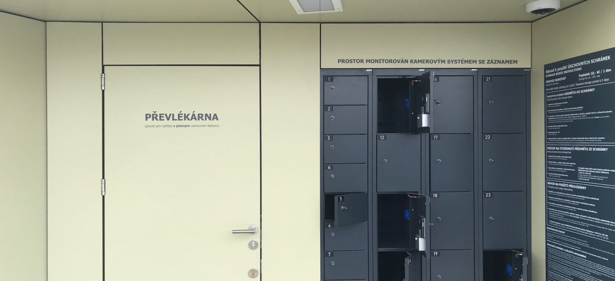 For the BikeTower Čelákovice, we have produced and supplied e-bike battery charging lockers. The lockers have a reinforced outdoor frame. The solid double plated doors resistant to bending and torsion are suspended on solid metal pivots.